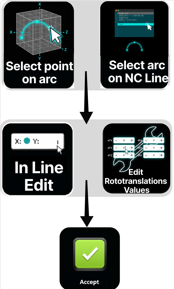 Selecting the G104 block from the NC Editor automatically selects both defining points of the arc.