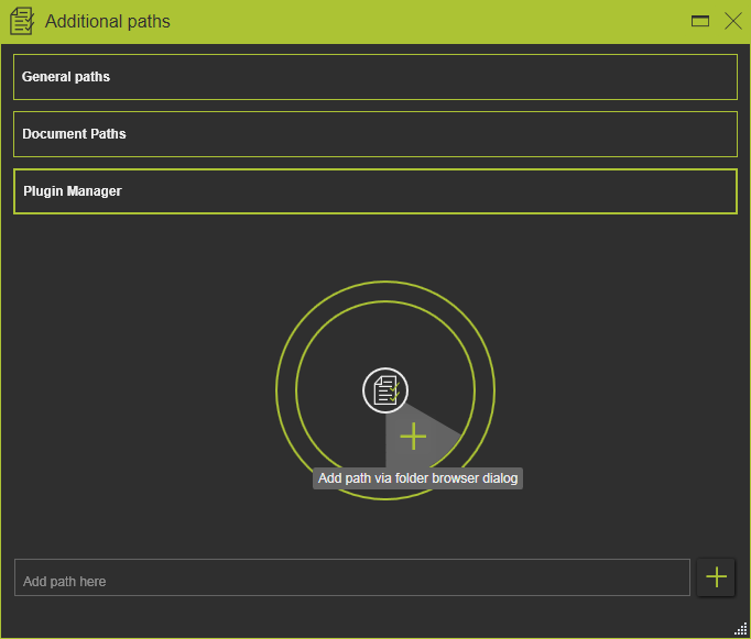 Opening the Pie menu (right mouse button) inside the container releases the Add command. Executing the command will open a standard file browser to search and select the Plugin folder. The path will be added to the search list, as in the example below: